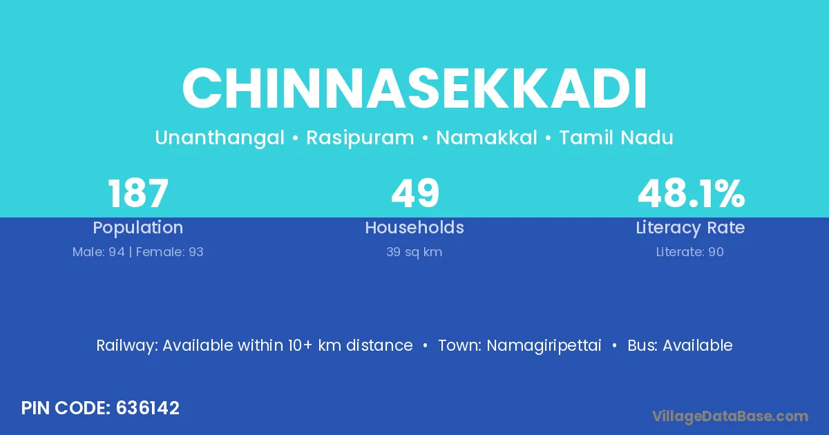 Chinnasekkadi village has a total population of 187 people, of which 94 are males and 93 are females.