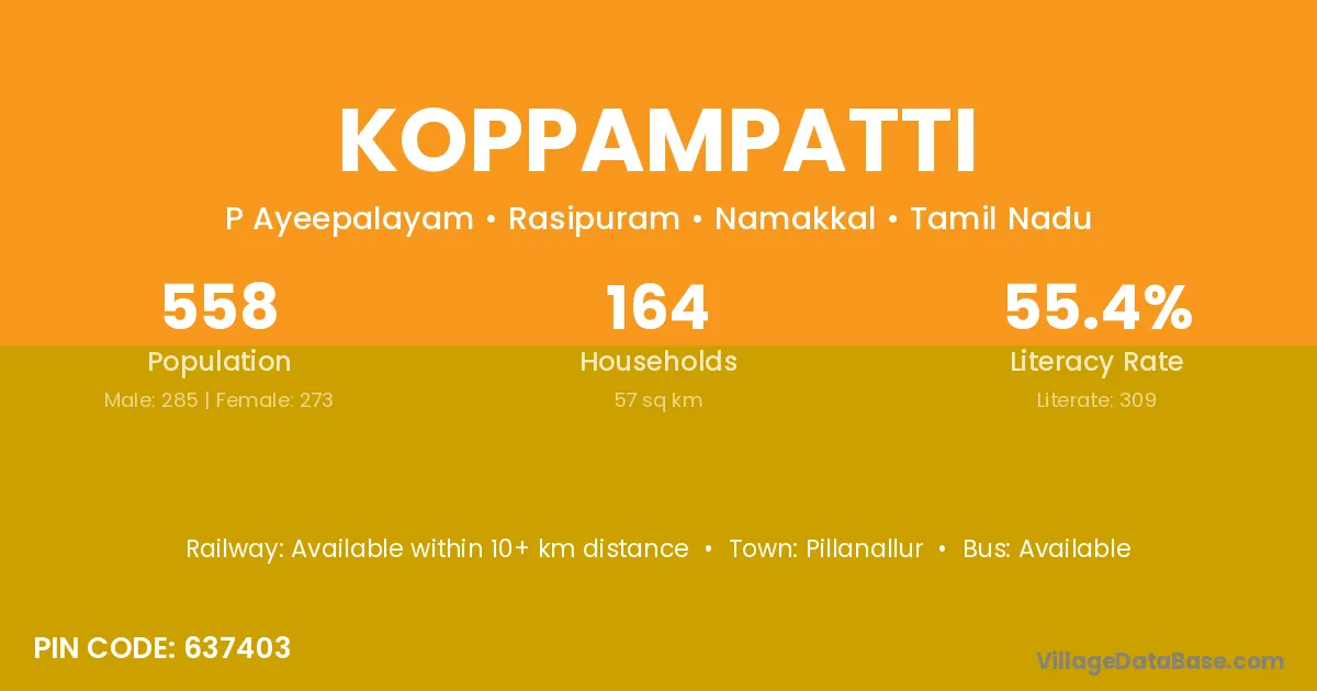 Koppampatti village has a total population of 558 people, of which 285 are males and 273 are females.