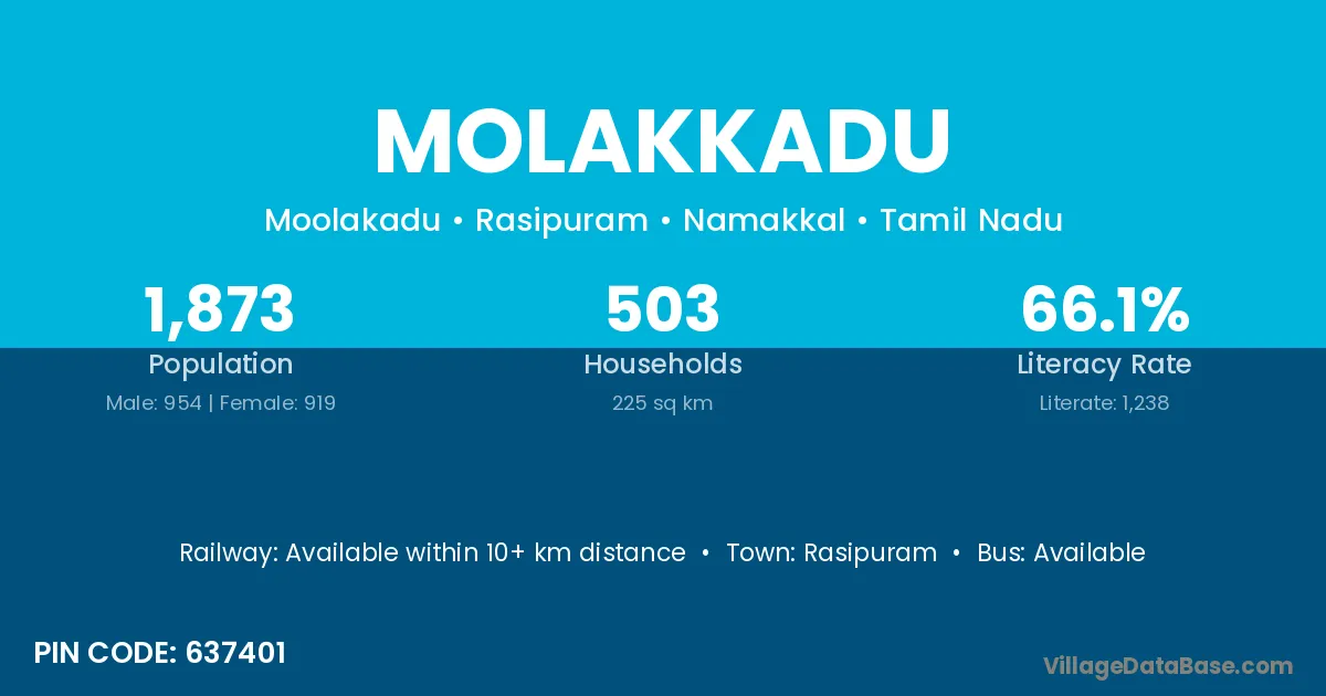 Molakkadu village has a total population of 1,873 people, of which 954 are males and 919 are females.