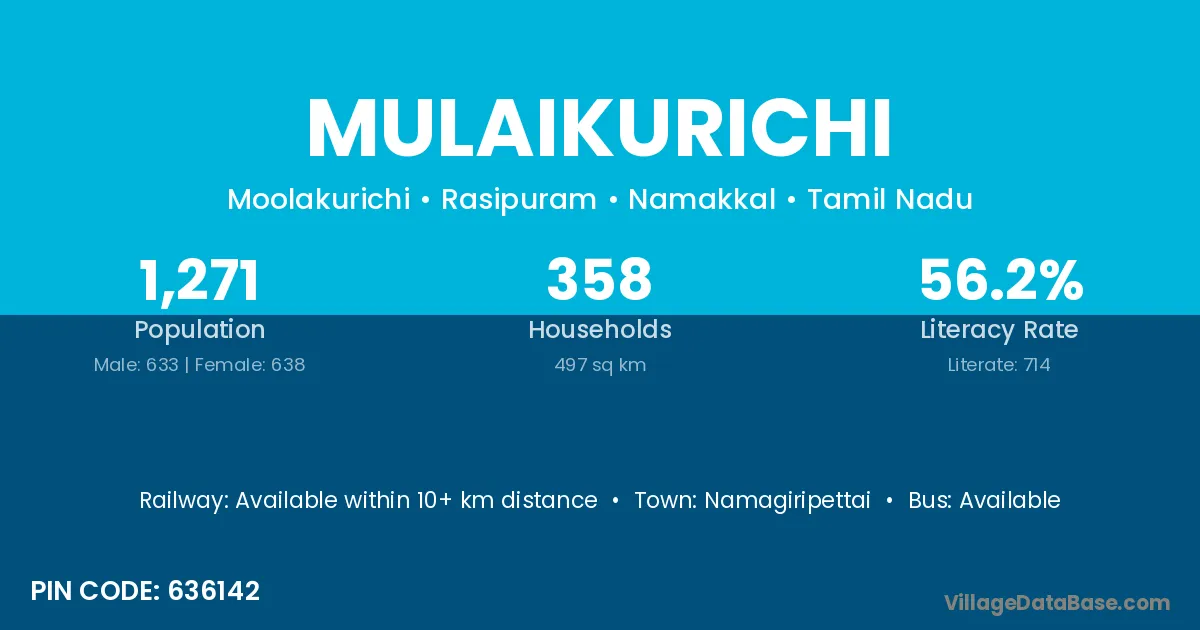Mulaikurichi village has a total population of 1,271 people, of which 633 are males and 638 are females.