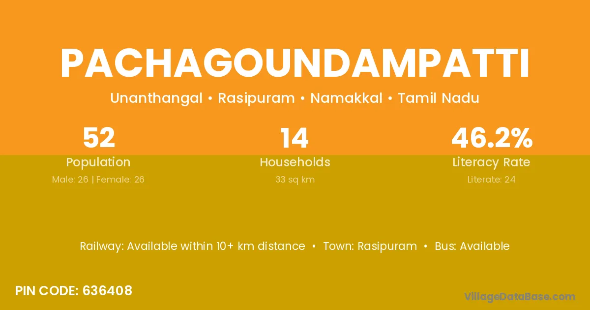 Pachagoundampatti village has a total population of 52 people, of which 26 are males and 26 are females.