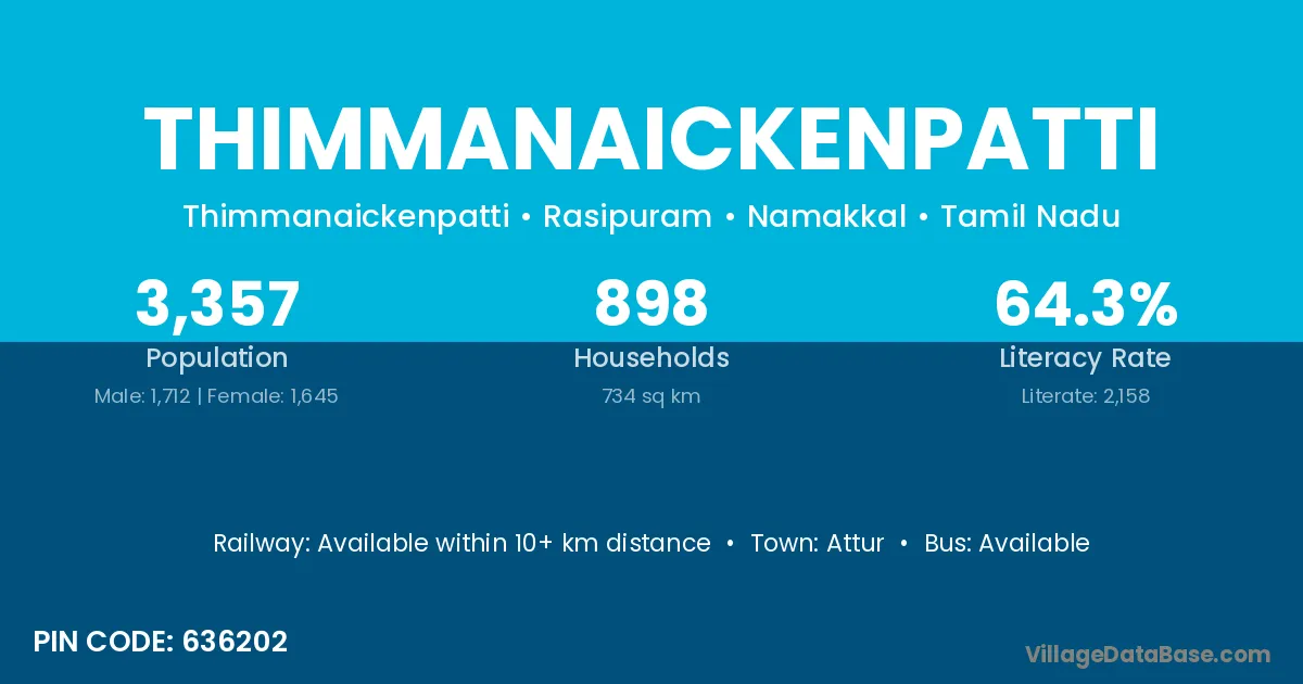 Thimmanaickenpatti village has a total population of 3,357 people, of which 1,712 are males and 1,645 are females.