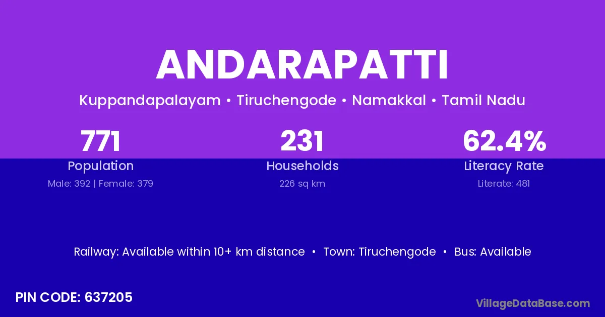 According to Census 2011 information, the village code of Andarapatti village is 637205.