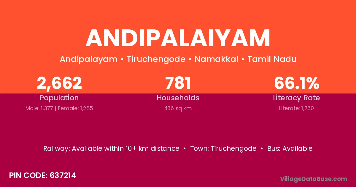 Tiruchengode is the nearest town to Andipalaiyam village for major economic activities