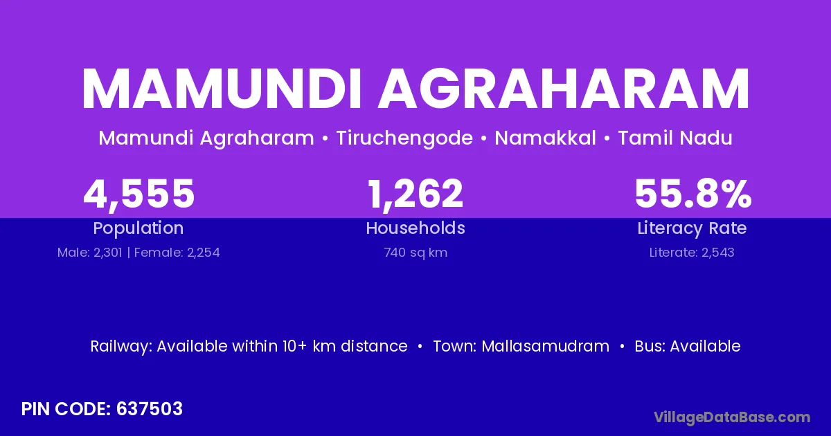 Mallasamudram is the nearest town to Mamundi Agraharam village for major economic activities