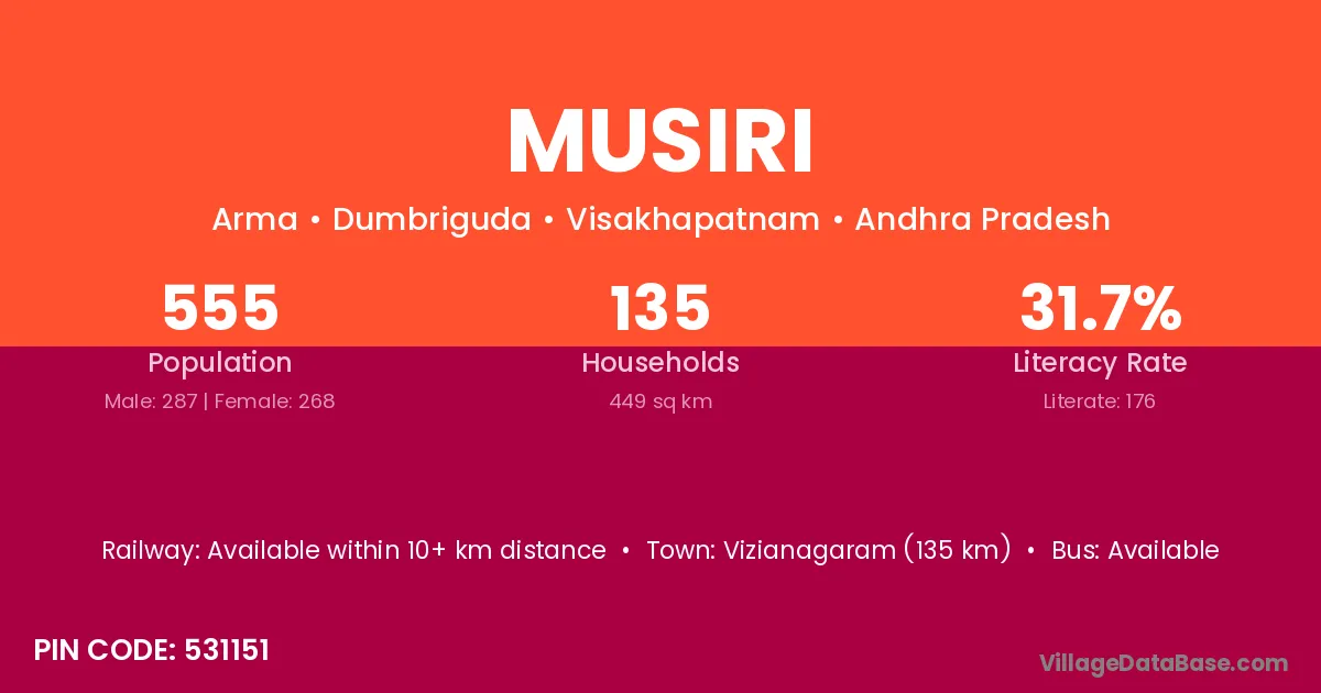 The literacy rate of Musiri village is 63.80%. Male literacy stands at 73.52% and female literacy at 54.32%.
