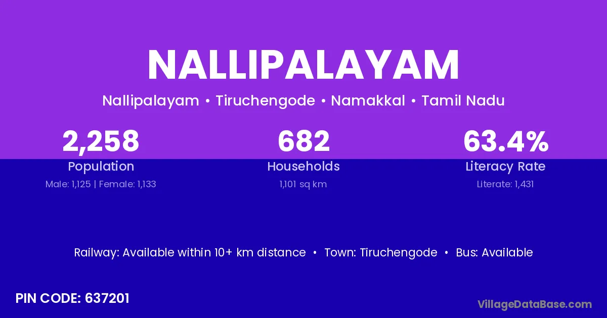 Nallipalayam village has a total population of 2,258 people, of which 1,125 are males and 1,133 are females.