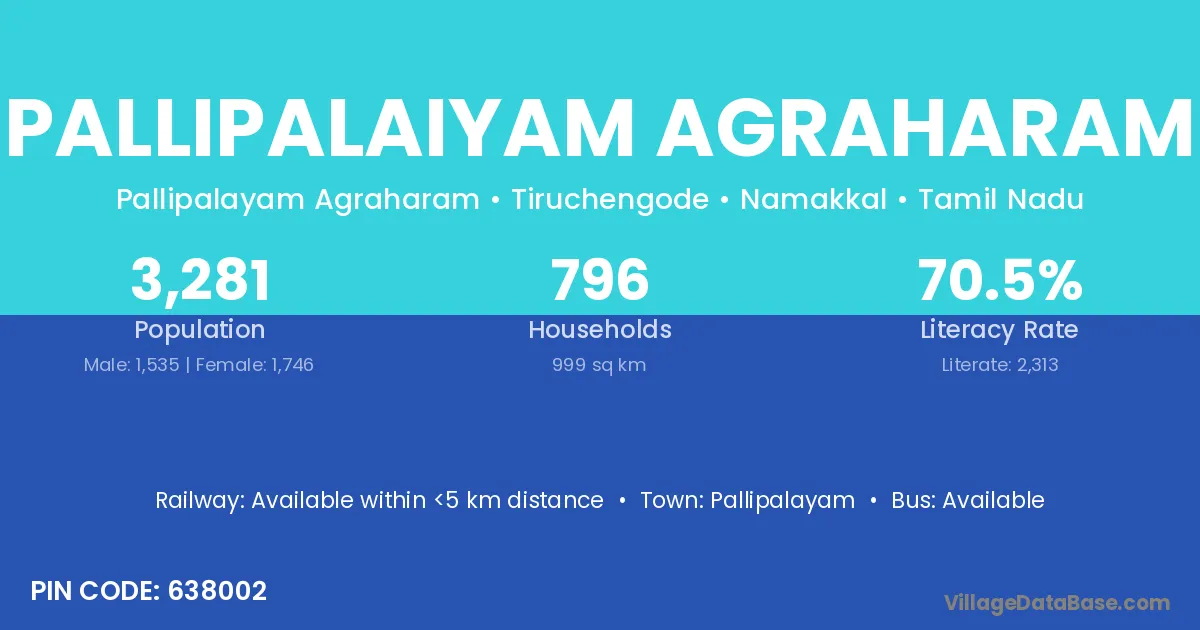 Pallipalaiyam Agraharam village has a total population of 3,281 people, of which 1,535 are males and 1,746 are females.