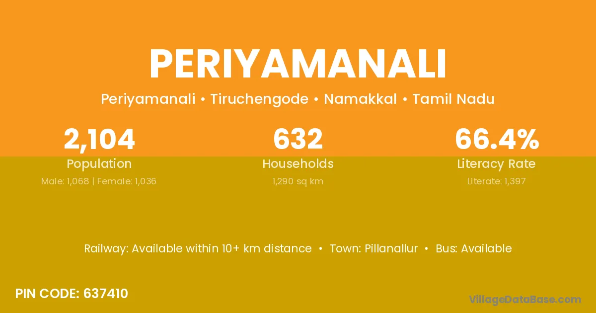Periyamanali village has a total population of 2,104 people, of which 1,068 are males and 1,036 are females.