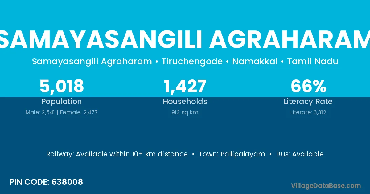 Samayasangili Agraharam village has a total population of 5,018 people, of which 2,541 are males and 2,477 are females.