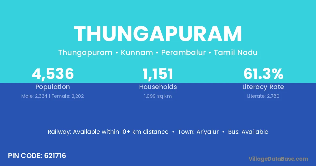 Ariyalur is the nearest town to Thungapuram village for major economic activities
