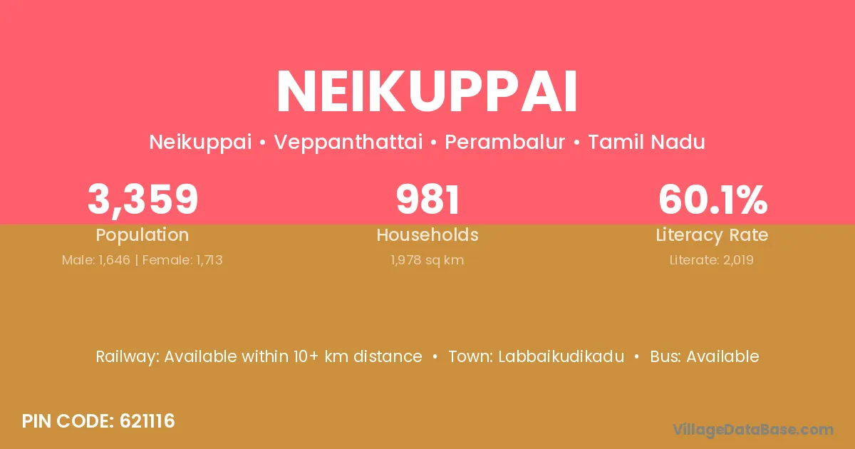 Neikuppai village has a total population of 3,359 people, of which 1,646 are males and 1,713 are females.