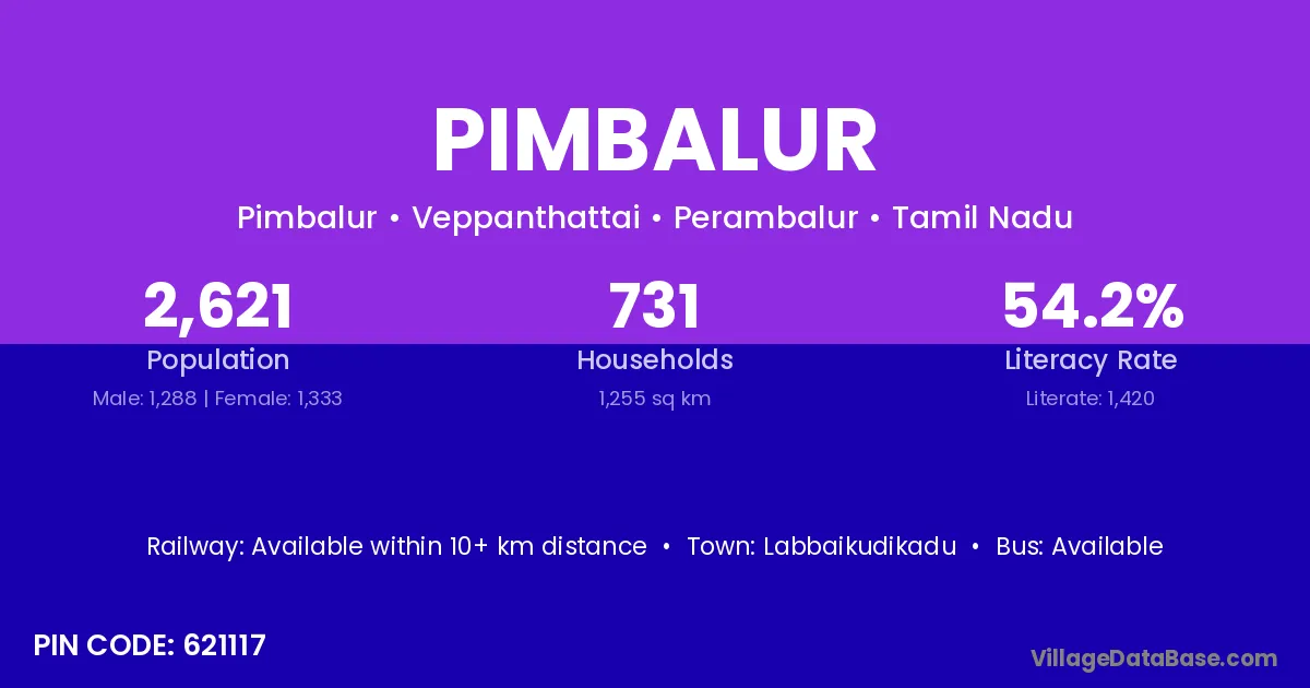 Pimbalur village has a total population of 2,621 people, of which 1,288 are males and 1,333 are females.