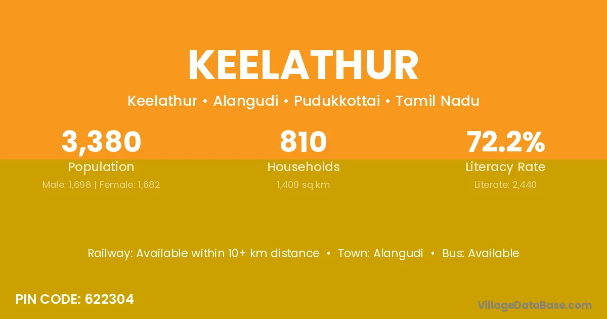 Keelathur village has a total population of 3,380 people, of which 1,698 are males and 1,682 are females.