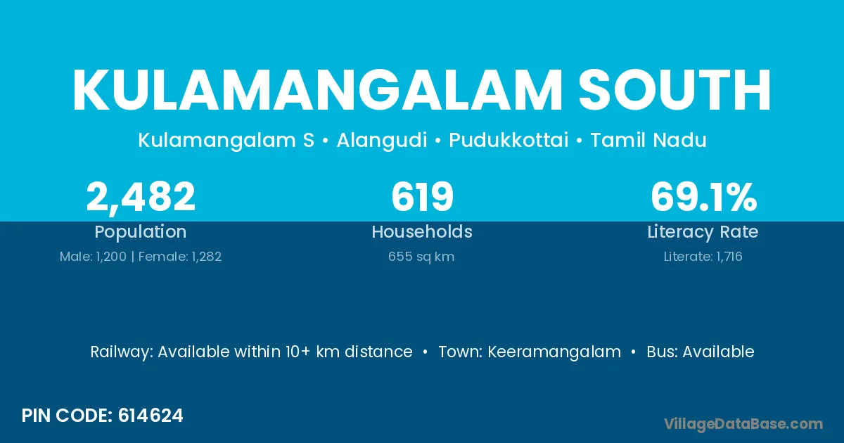The literacy rate of Kulamangalam South village is 69.14%. Male literacy stands at 75.92% and female literacy at 62.79%.