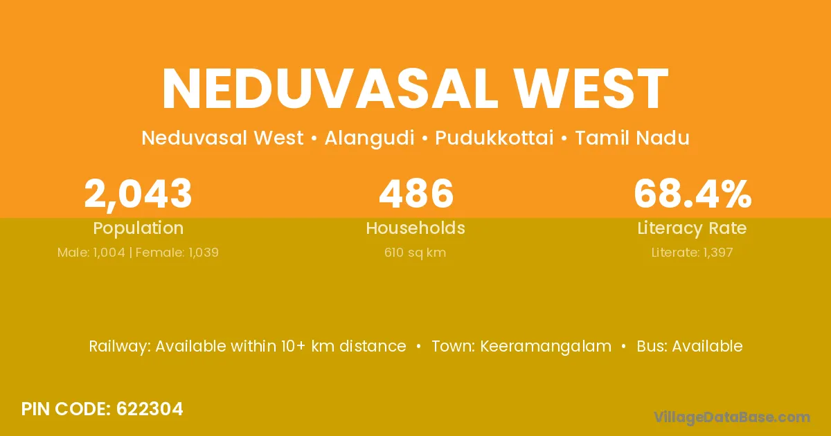 Neduvasal West village has a total population of 2,043 people, of which 1,004 are males and 1,039 are females.