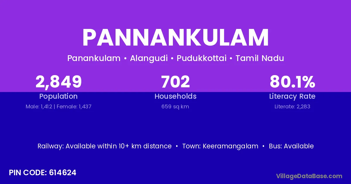 Pannankulam village has a total population of 2,849 people, of which 1,412 are males and 1,437 are females.