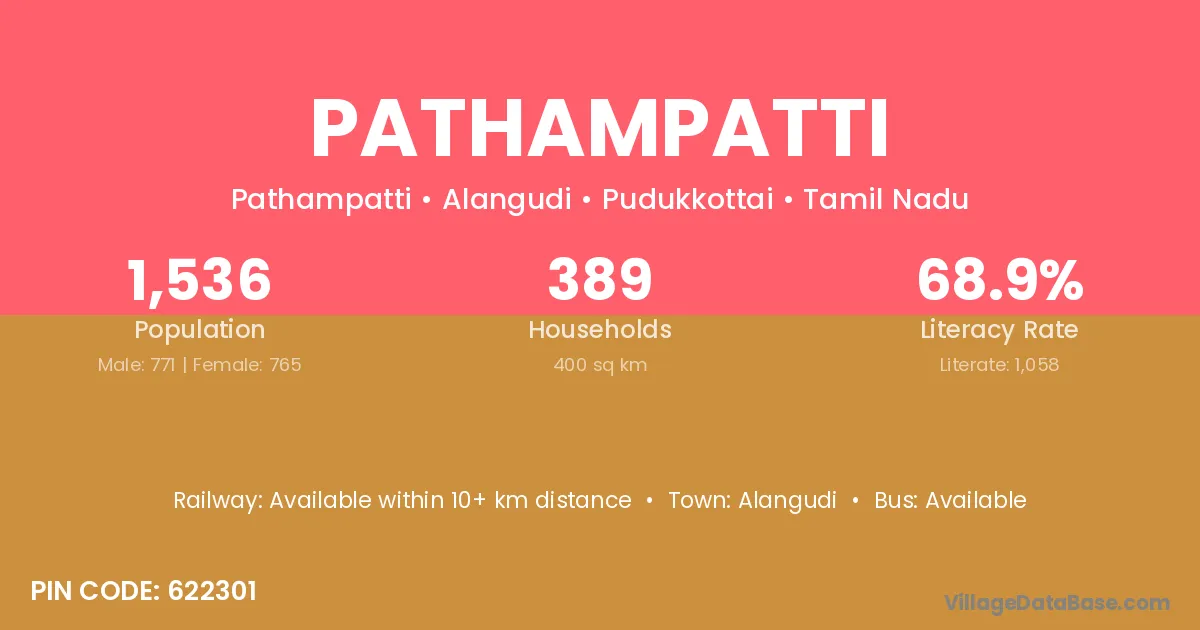 Pathampatti village has a total population of 1,536 people, of which 771 are males and 765 are females.