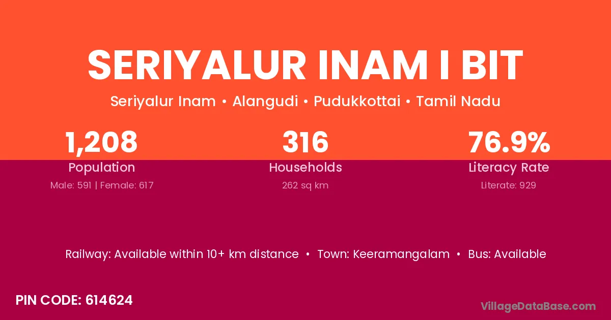Seriyalur Inam I Bit village has a total population of 1,208 people, of which 591 are males and 617 are females.