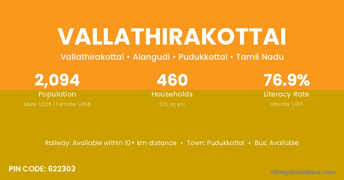 Vallathirakottai village has a total population of 2,094 people, of which 1,028 are males and 1,066 are females.