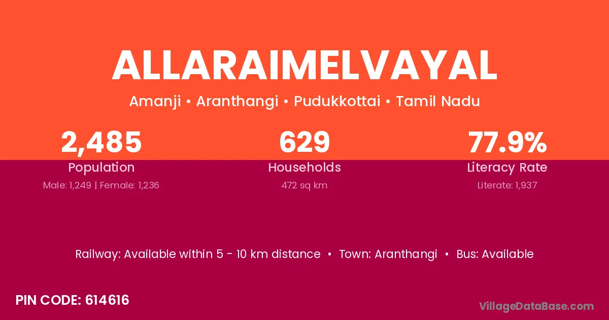 Allaraimelvayal village has a total population of 2,485 people, of which 1,249 are males and 1,236 are females.