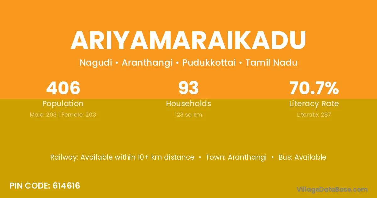 Ariyamaraikadu village has a total population of 406 people, of which 203 are males and 203 are females.