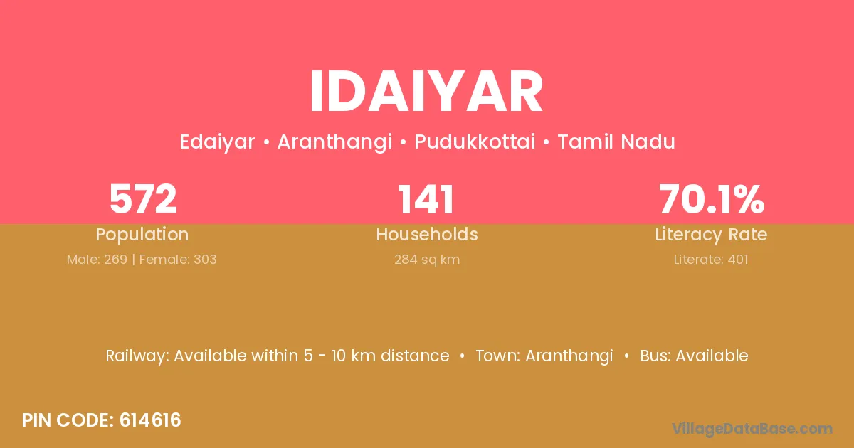Aranthangi is the nearest town to Idaiyar village for major economic activities