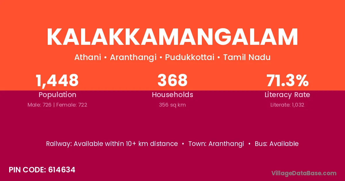 Kalakkamangalam village has a total population of 1,448 people, of which 726 are males and 722 are females.