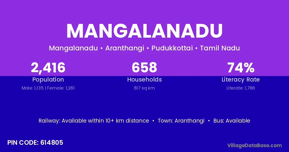 Aranthangi is the nearest town to Mangalanadu village for major economic activities