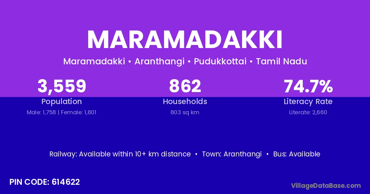 Aranthangi is the nearest town to Maramadakki village for major economic activities