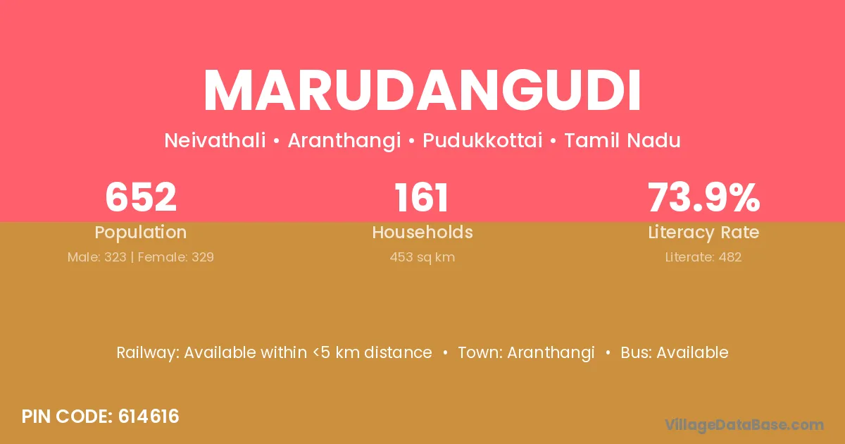 Marudangudi village has a total population of 652 people, of which 323 are males and 329 are females.