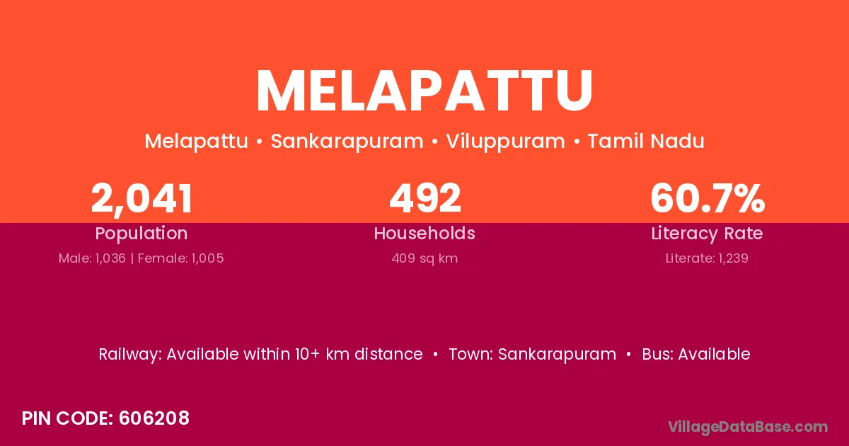 The literacy rate of Melapattu village is 71.67%. Male literacy stands at 78.15% and female literacy at 65.33%.