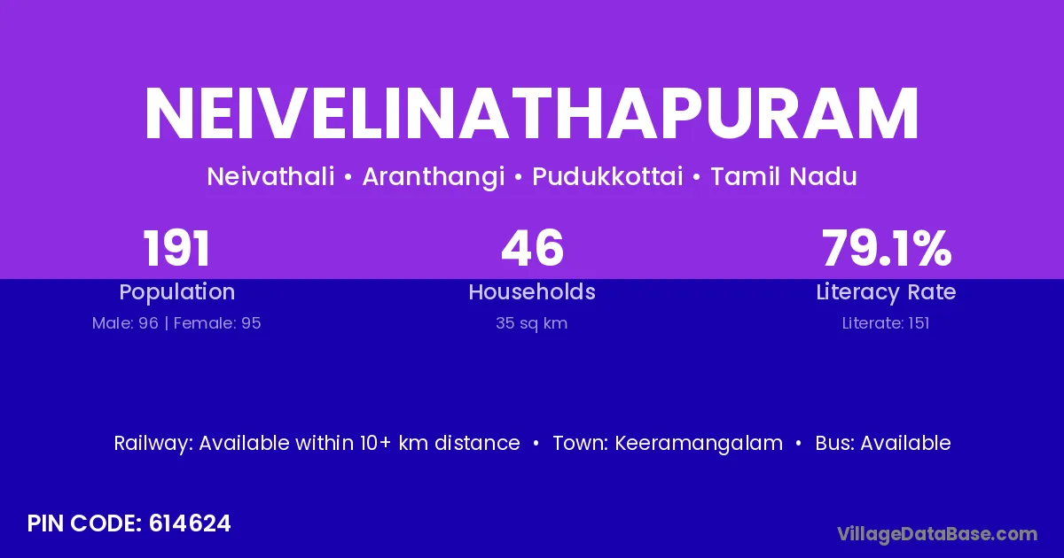 Neivelinathapuram village has a total population of 191 people, of which 96 are males and 95 are females.