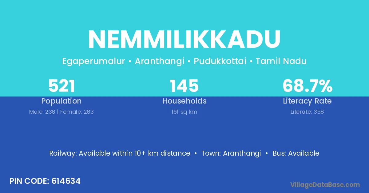 Aranthangi is the nearest town to Nemmilikkadu village for major economic activities