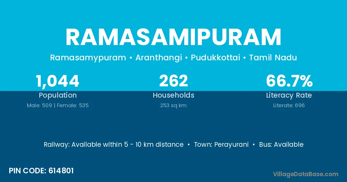 Ramasamipuram village has a total population of 1,044 people, of which 509 are males and 535 are females.