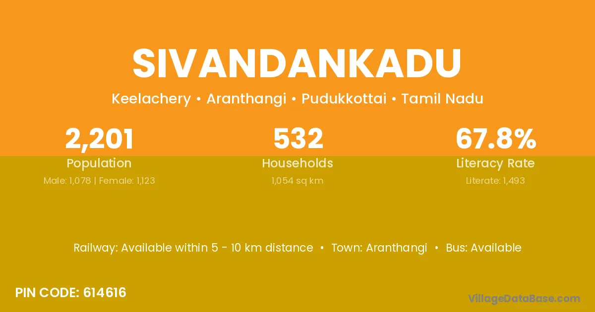Sivandankadu village has a total population of 2,201 people, of which 1,078 are males and 1,123 are females.