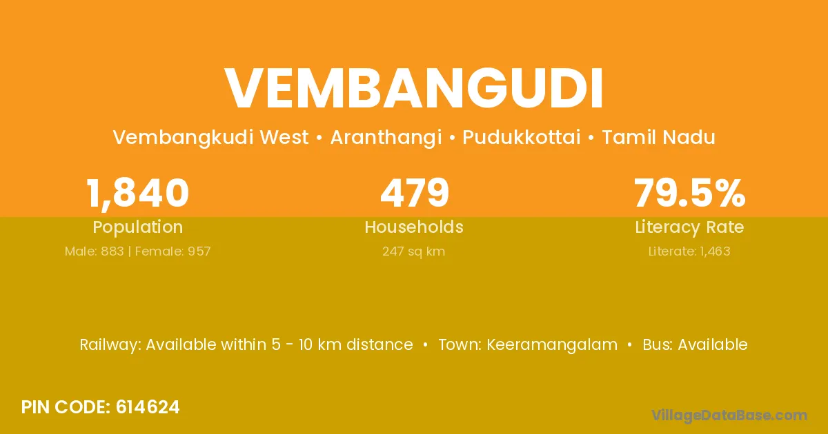 Vembangudi village has a total population of 1,840 people, of which 883 are males and 957 are females.