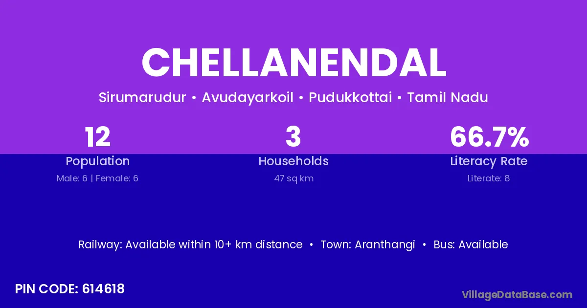 Chellanendal village has a total population of 12 people, of which 6 are males and 6 are females.