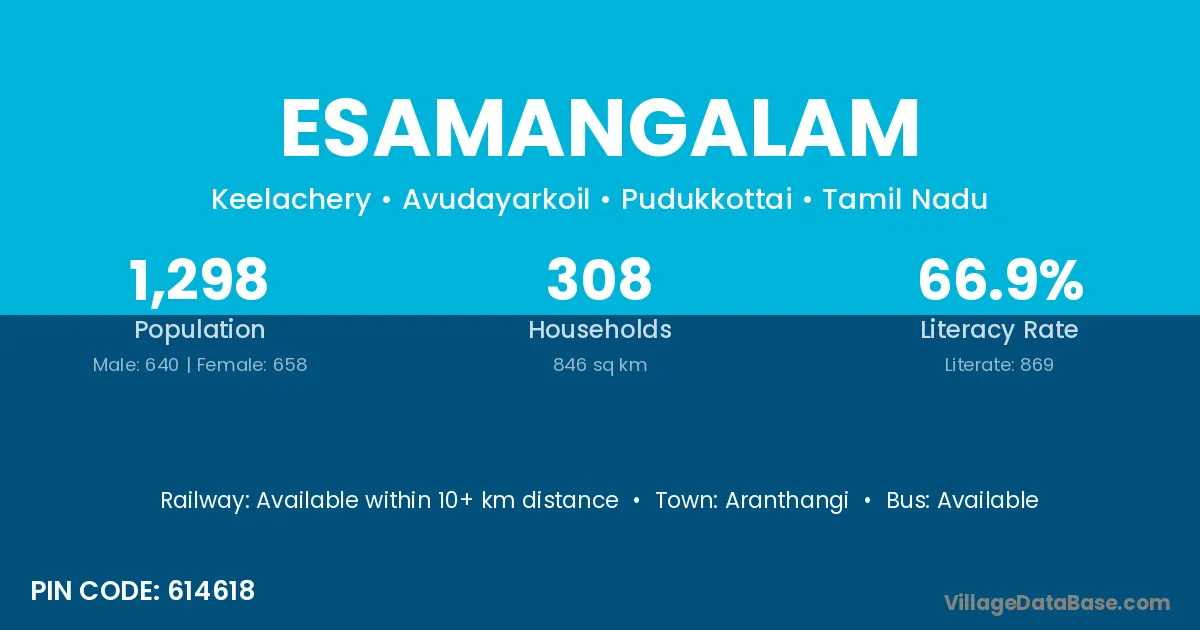 Esamangalam village has a total population of 1,298 people, of which 640 are males and 658 are females.