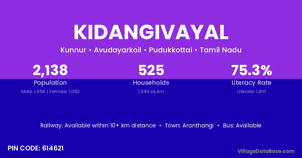 Kidangivayal village has a total population of 2,138 people, of which 1,056 are males and 1,082 are females.