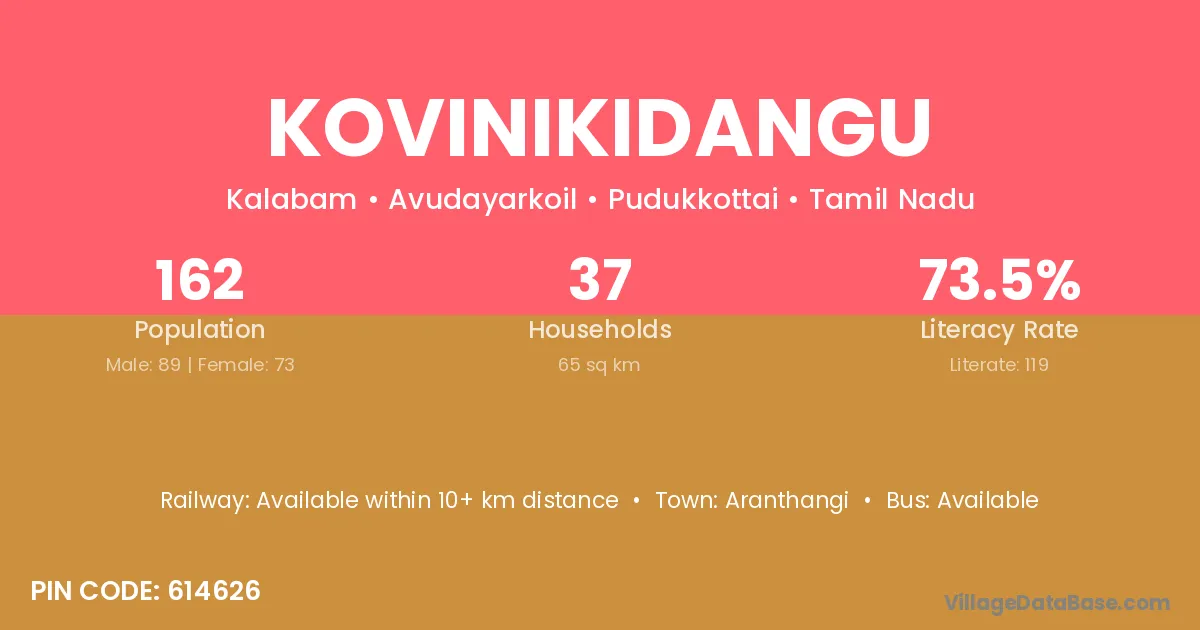 Kovinikidangu village has a total population of 162 people, of which 89 are males and 73 are females.