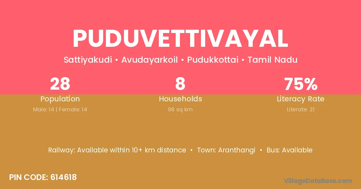 Aranthangi is the nearest town to Puduvettivayal village for major economic activities
