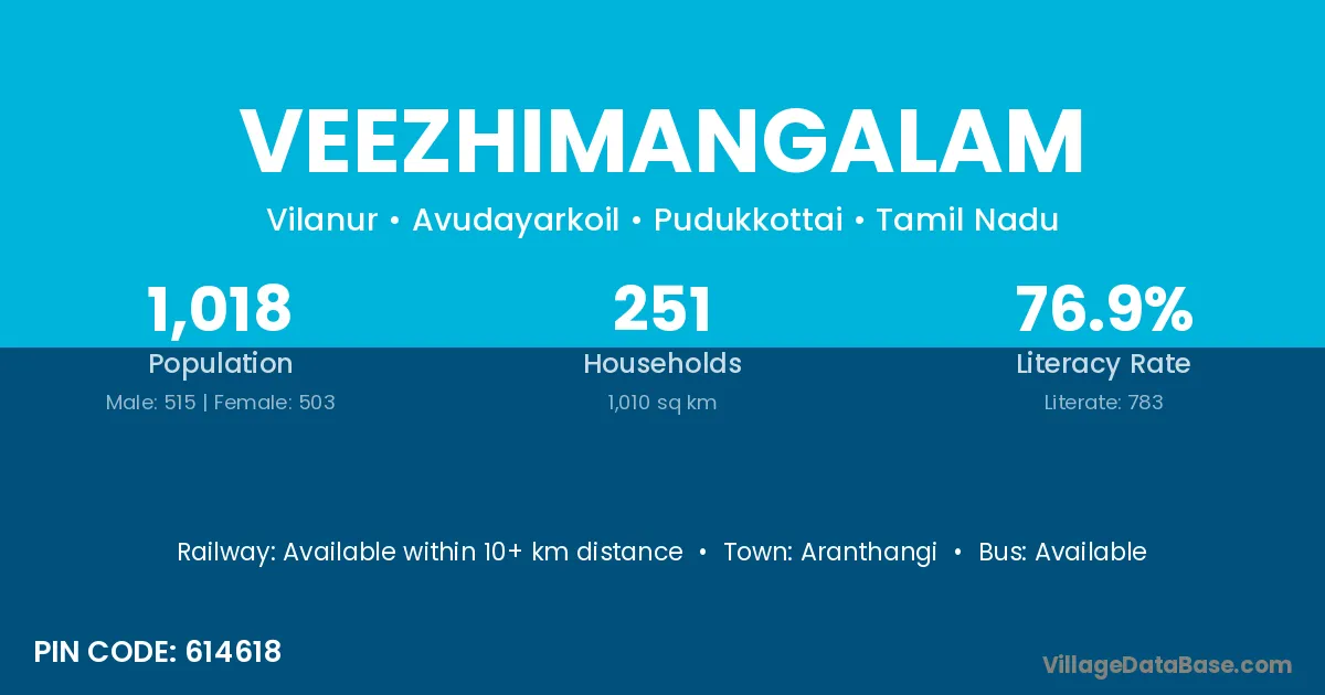 Veezhimangalam village has a total population of 1,018 people, of which 515 are males and 503 are females.