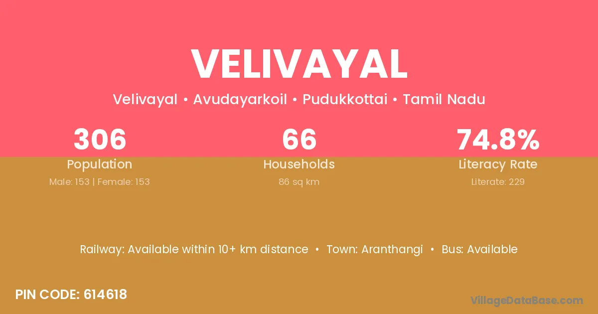 Velivayal village has a total population of 306 people, of which 153 are males and 153 are females.