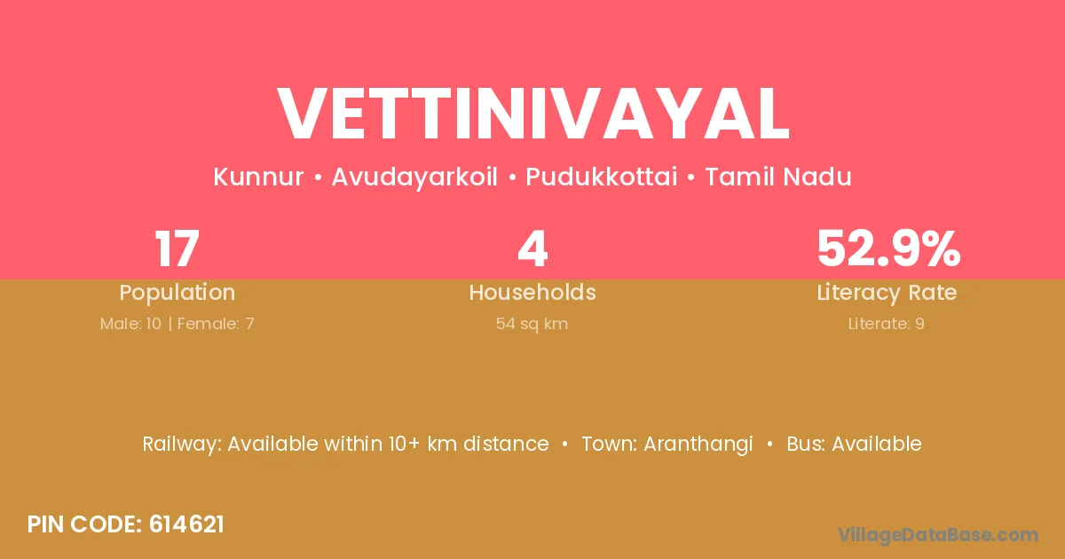 Vettinivayal village has a total population of 17 people, of which 10 are males and 7 are females.
