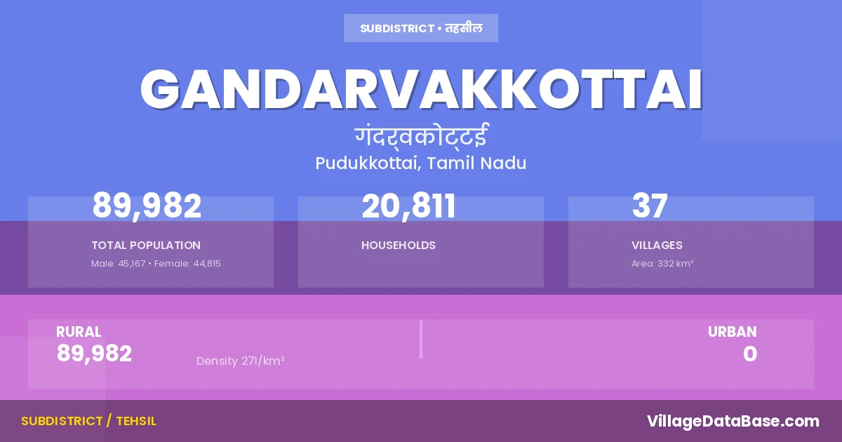 According to the 2011 census The total area of Gandarvakkottai Taluka is 332 km², with a population of 89982 people. The population density is 271 inhabitants per square kilometre, and there are approximately 20811 houses in the sub district.