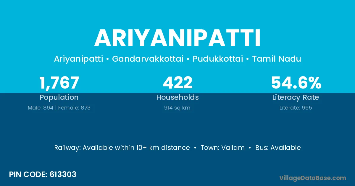 Ariyanipatti village has a total population of 1,767 people, of which 894 are males and 873 are females.