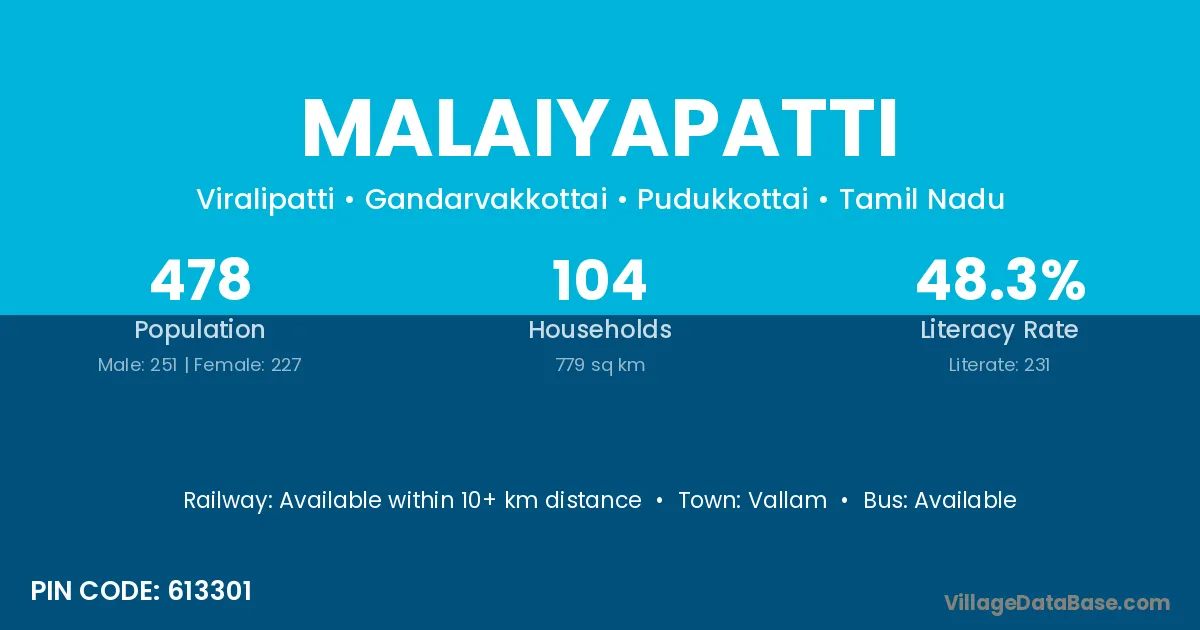 Malaiyapatti village has a total population of 478 people, of which 251 are males and 227 are females.