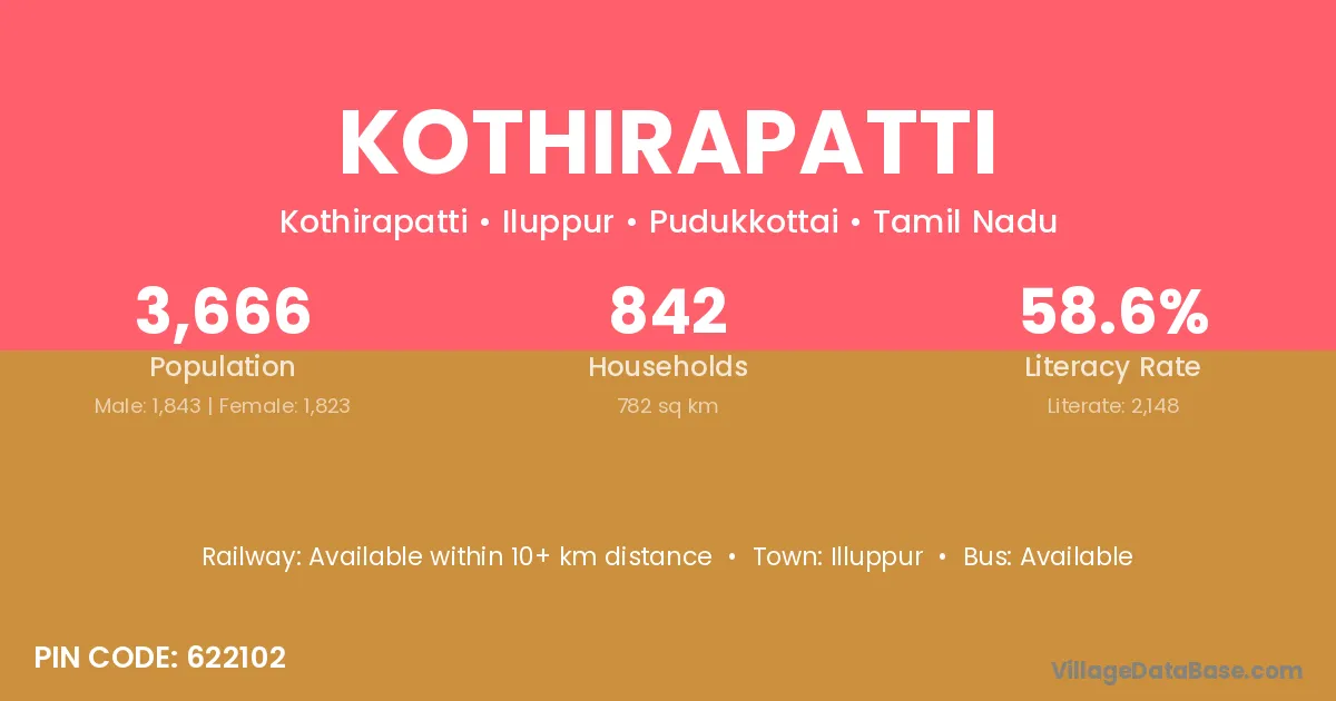 Kothirapatti village has a total population of 3,666 people, of which 1,843 are males and 1,823 are females.