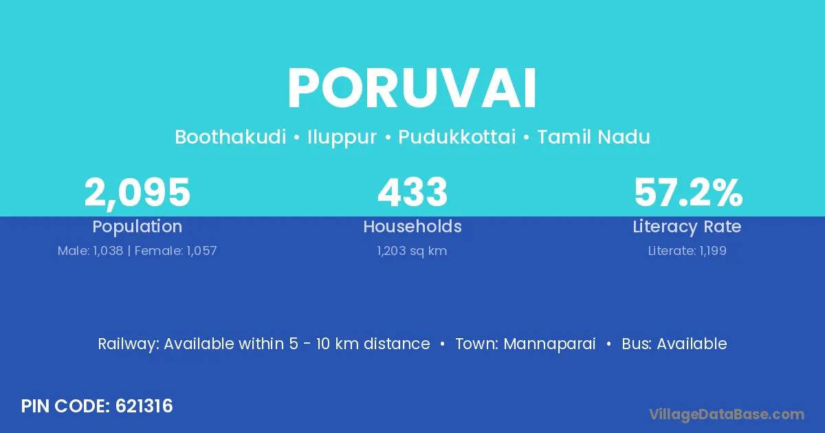 Poruvai village has a total population of 2,095 people, of which 1,038 are males and 1,057 are females.